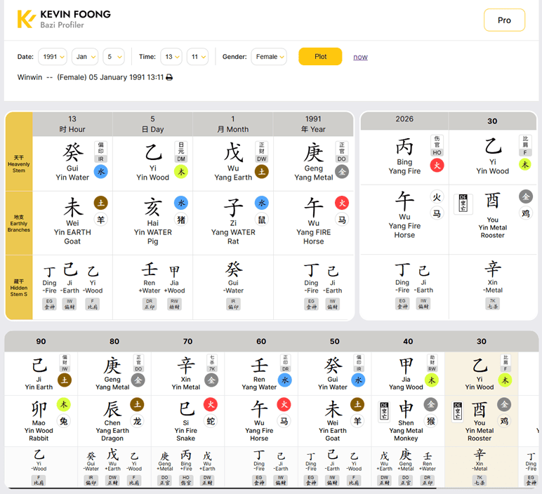 What changes over time are your Luck Pillars (Da Yun) and yearly/monthly influences. These shifting cycles create the changing “seasons” of your life.