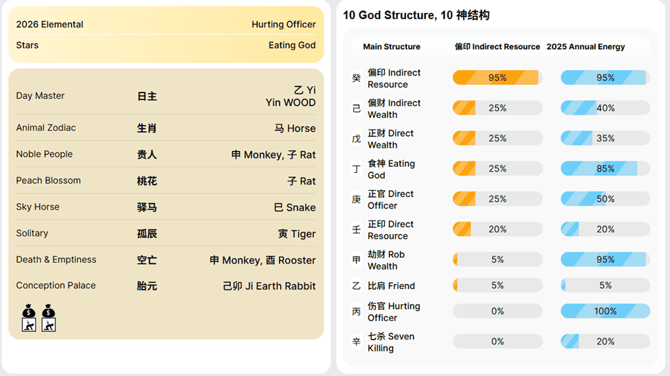 Associated with your children, legacy, creativity, hidden talents, and how you express yourself privately. It also shows the direction of your later life.Together, these Four Pillars form a sophisticated “destiny code” that reveals the underlying structure of your life.