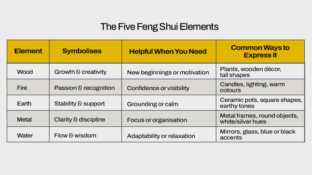 - Elements: Using the Five Elements (Wood, Fire, Earth, Metal, and Water) to encourage growth, stability, and positive flow in different parts of your life, such as health, wealth, or relationships.